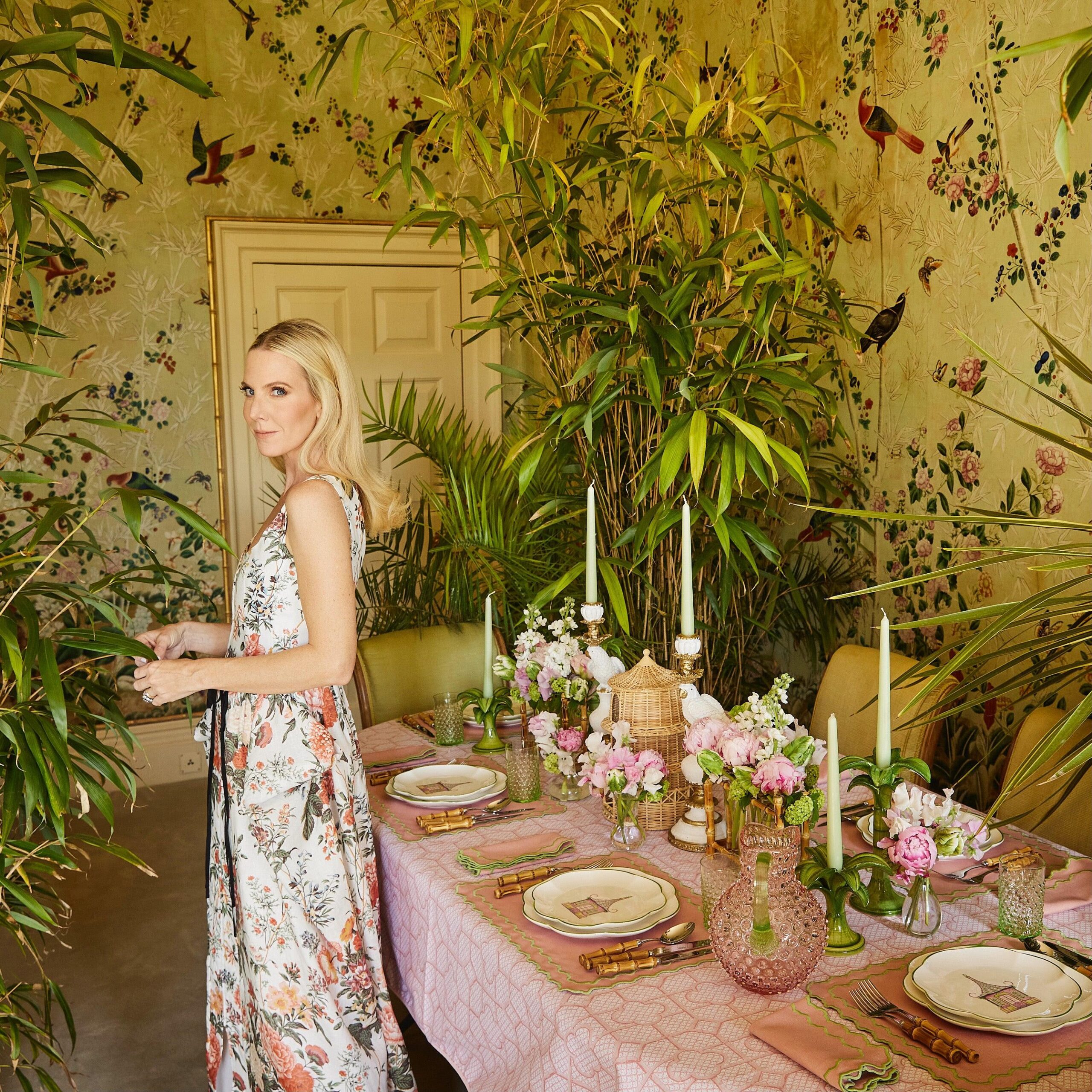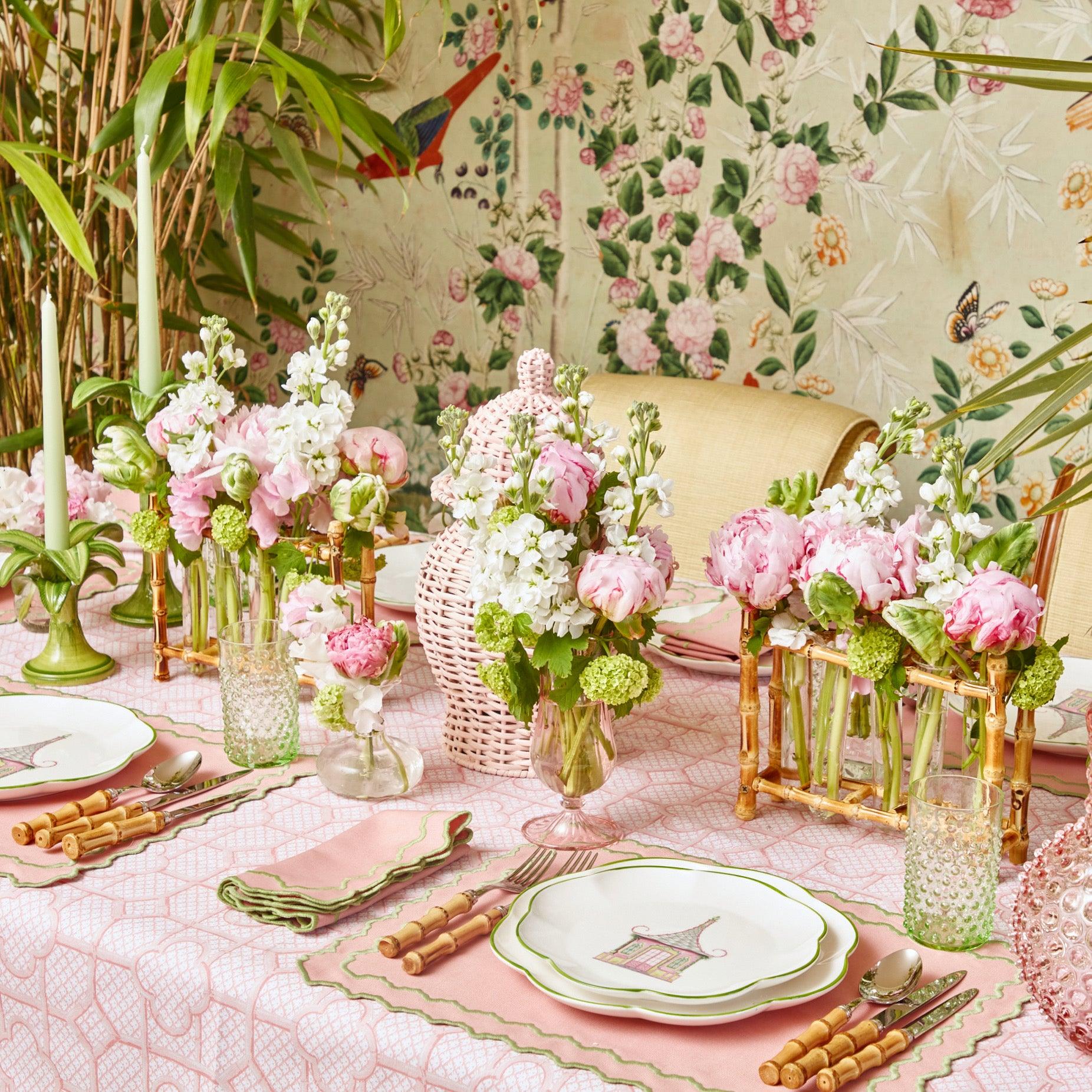 Designed by Alice’s Mother Serena, this plate is matched with our Pink & Green Scalloped Pagoda Dinner Plate, Pink Bamboo Trellis Tablecloth & Pink Penelope Linen.