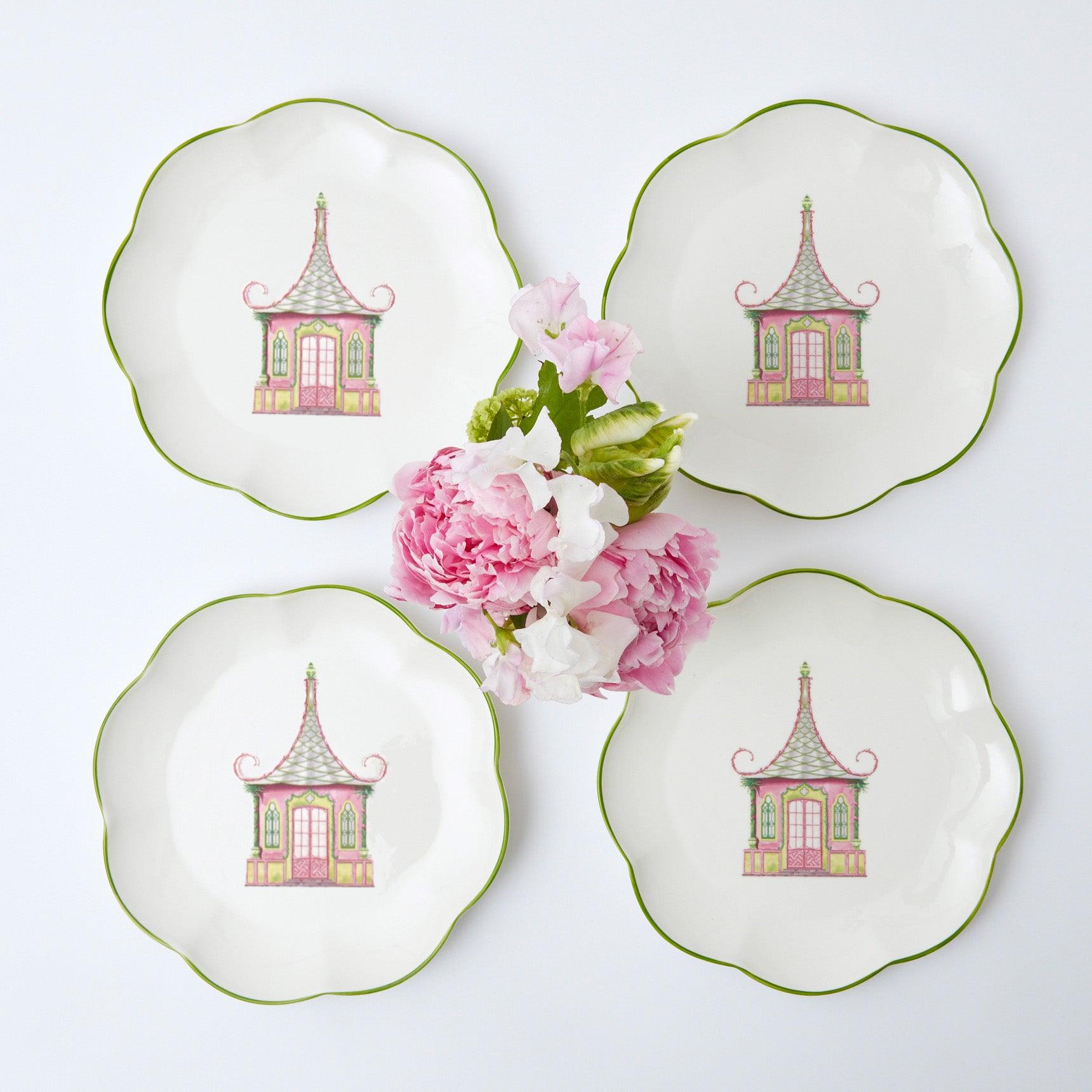 With a fresh green hand painted rim, our exclusive scalloped Starter Plate features a elegant pink Chinoiserie Pagoda.